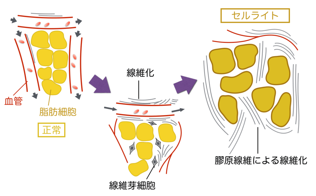 といった状態が重なると、組織が硬く、粘着質になり、セルライトが形成されていきます。